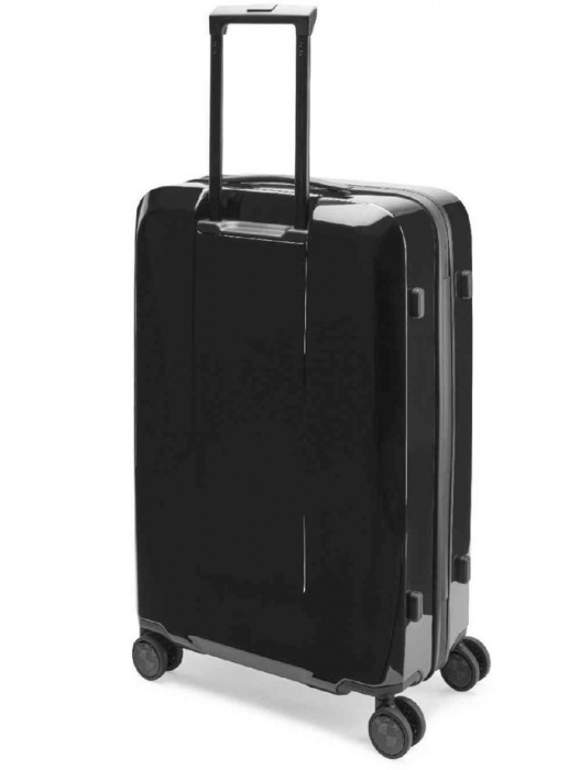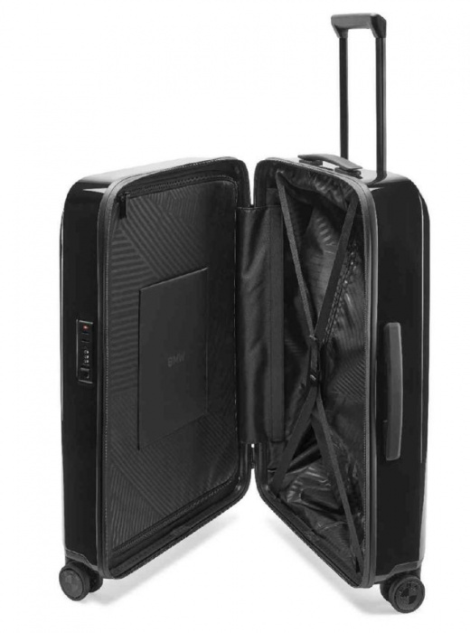 BMW ceļojumu čemodāns spīdīgi melnā krāsā ar reljefu BMW uzrakstu.