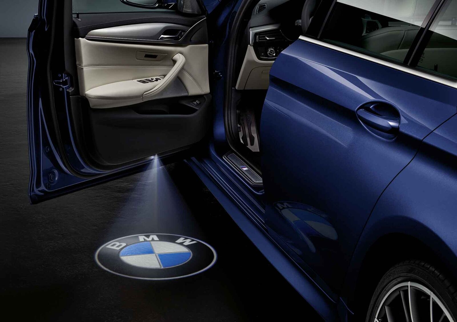 BMW inovatīvie LED durvju projektori padara iekāpšanu un izkāpšanu no automašīnas ārkārtīgi patīkamu! Tie tiek automātiski aktivizēti, kad tiek atvērtas durvis, un izgaismo ieejas zonu, projicējot attēlu uz zemes blakus transportlīdzeklim. Vadītājs var personīgi izvēlēties projicēto attēlu, izmantojot maināmus slaidus, kas nodrošina izvēli starp BMW logotipu un BMW M logotipu. Tāpēc pat vājā apgaismojumā durvju projektori nodrošina individuālu pieredzi, iekāpjot automašīnā vai izkāpjot no tās. Tie ir vienkārši uzstādāmi esošo durvju ieejas lukturu vietā un ir lieliski piemēroti BMW borta barošanas avotam.