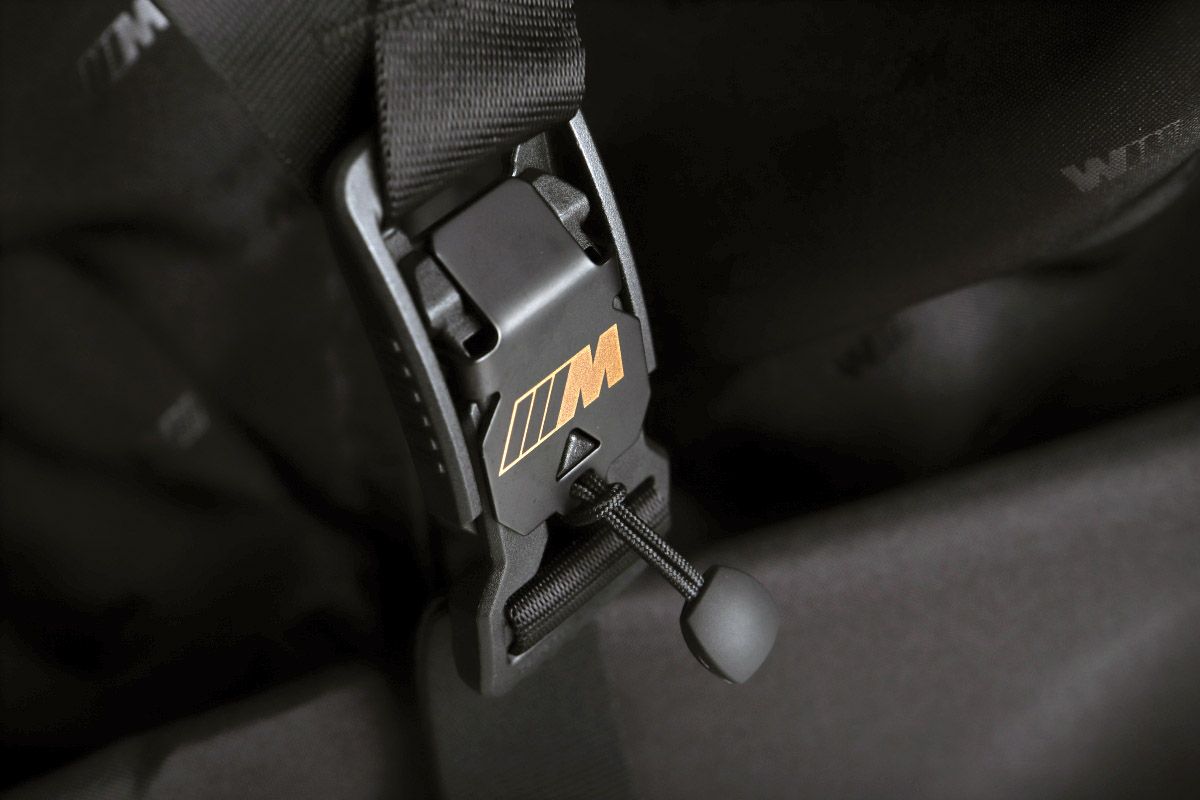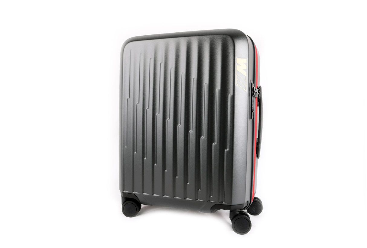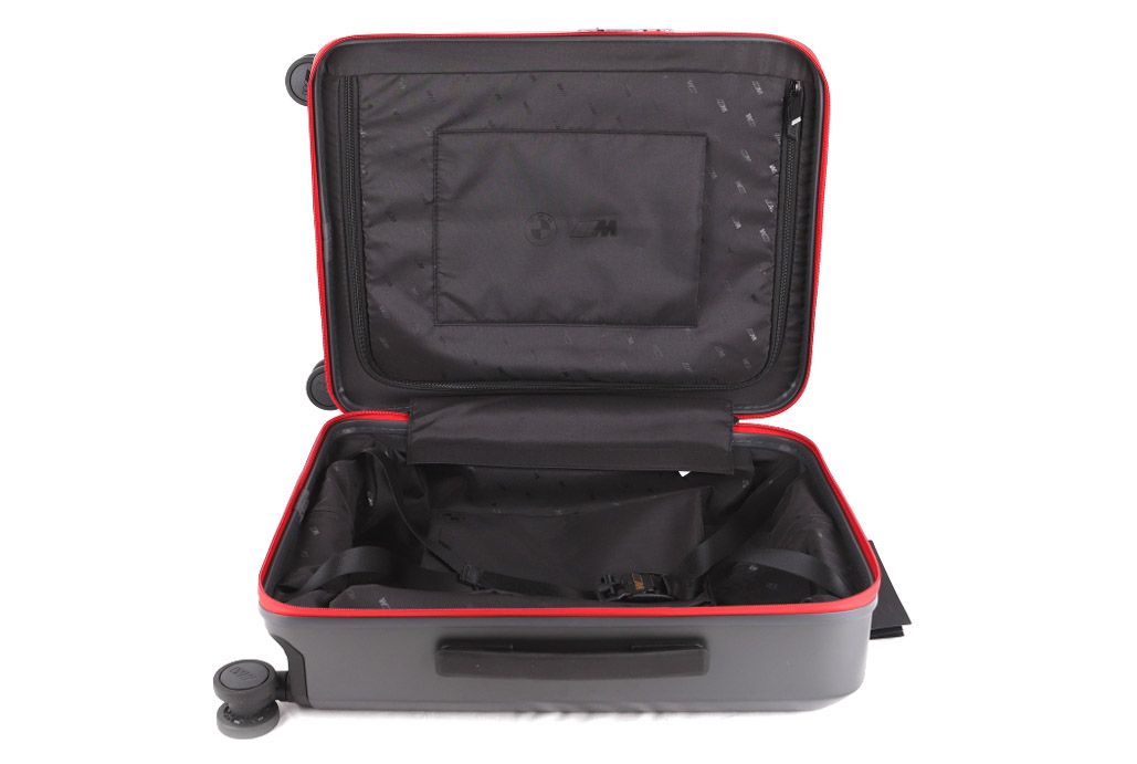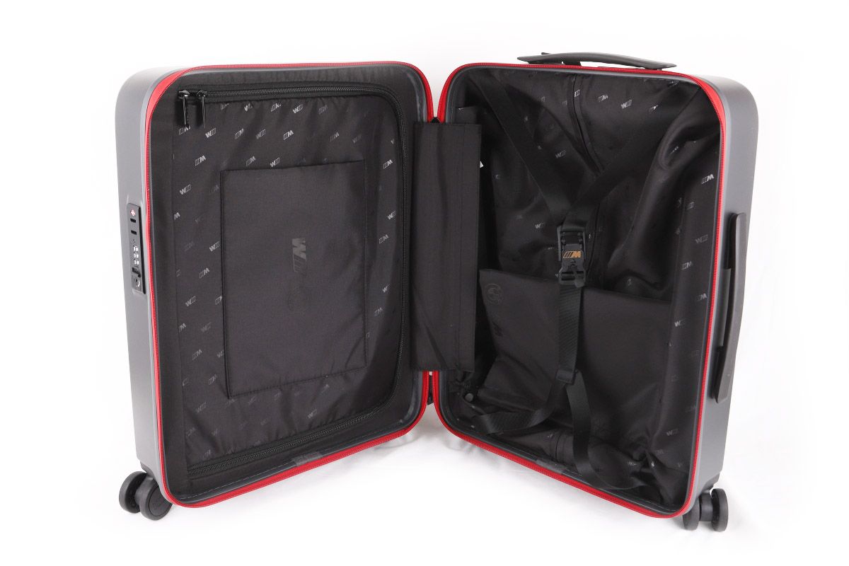 Augstas kvalitātes kompakts BMW M rokas bagāžas koferis matēti tumši pelēkā krāsā. Tam ir pilnībā grozāmi, skaņu absorbējoši riteņi, līdzīgi kā BMW automašīnās. Integrēta numura zīmes slēdzene. Izturīgi, ūdensnecaurlaidīgi YKK rāvējslēdzēji ar M logotipu. Teleskopisks rokturis no matēti melna anodēta alumīnija. Matēti melns M logotips. Cieta materiāla soma ar 3D BMW M logotipu. Iekšējais sieta nodalījums sīkiem priekšmetiem un elastīgas siksnas apģērba nostiprināšanai. Magnētiska Fidlock aizdare ar M logotipu uz siksnām apģērba nostiprināšanai.